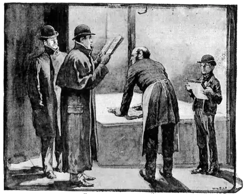 "His remarks were suddenly cut short by a loud hubbub which broke out from the stall which we had just left. Turning round we saw a little rat-faced fellow standing in the centre of the circle of yellow light which was thrown by the swinging lamp, while Breckinridge the salesman, framed in the door of his stall, was shaking his fists fiercely at the cringing figure.