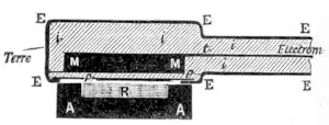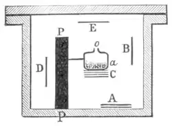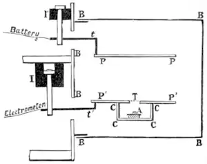 and of furnishing figures which are comparable. The apparatus employed by me for the purpose consists essentially of a plate condenser, a b (Fig. 1). The active body, finely powered, is spread over the plate b, making the air between the plates a conductor. In order to measure the conductivity, the plate b is raised to a high potential by connecting it with one pole of a battery of small accumulators, p, of which the other pole is connected to earth. The plate a being maintained at the potential of the earth by the connection c d, an electric current is set up between the two plates. The potential of plate a is recorded by an electrometer, e. If the earth connection be broken at c, the plate a becomes charged, and this charge causes a deflection of the electrometer. The velocity of the deflection is proportional to the intensity of the current and serves to measure the latter.