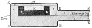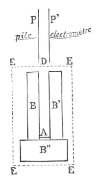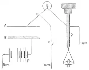 But a preferable method of measurement is that of compensating the charge on plate a, so as to cause no deflection of the electrometer. The charges in question are extremely weak; they may be compensated by means of a quartz electric balance, a, one sheath of which is connected to plate a and the other to earth. The quartz lamina is subjected to a known tension, produced by placing weights in a plate, π; the tension is produced progressively, and has the effect of generating progressively a known quantity of electricity during the time observed. The operation can be so regulated that, at each instant, there is compensation between the quantity of electricity that traverses the condenser and that of the opposite kind furnished by the quartz. In this way, the quantity of electricity passing through the condenser for a given time, i.e., the intensity of the current, can be measured in absolute units. The measurement is independent of the sensitiveness of the electrometer.