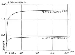 Fig. 2 shows that the intensity of the current becomes constant for high potential differences between the plates. Fig. 3 represents the same curves on another scale, and