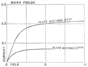 Secondly, in order to obtain the limiting current relatively to a given radiation, it is necessary, on the one hand, to cause complete absorption of this radiation by the gas by employing a sufficient mass of it; on the other hand, it is necessary for the production of the current to use all the ions generated by establishing an electric field of such strength that the number of the ions which recombine may be a negligible fraction of the total number of ions produced in the same time, most of which are carried by the current to the electrodes. The strength of the electric field necessary to give this result is proportional to the amount of ionisation.
