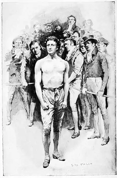 With great speed and exactness every preparation was rapidly made by these experienced men. Mendoza and Dutch Sam were commissioned to attend to Berks, while Belcher and Jack Harrison did the same for Boy Jim. Sponges, towels, and some brandy in a bladder were passed over the heads of the crowd for the use of the seconds.