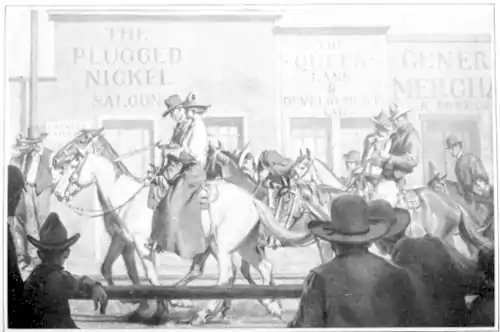 There was nothing evasive about the sheriff's coming to Mammoth. He pulled his fagged pony to a walk where the stores began to rank themselves; his saddle seat was easy to a shade of slovenliness; he rolled and lit a cigarette. One would have said he'd just run down to Clear Creek to look at a burnt brand. Up went his hand in a lazy wave to answer greetings from the wooden side-walk to right and left; his slow smile was everybody's to possess. But idlers jumping quickly out through saloon doors at the shrilled word of report, storekeepers bustling to the curb on flimsy pretext, riders turning in their saddles to stare behind them—none of these was deceived by the sheriff's studied nonchalance.