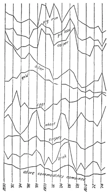 - ↑ The figures for these curves were easily found by dividing the index number for any commodity, pig iron, for instance, by the index number for commodities in general.