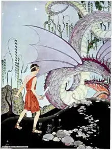 But Cadmus was so enraged at the destruction of his friends, that he cared neither for the size of the dragon's jaws nor for his hundreds of sharp teeth. Drawing his sword, he rushed at the monster, and flung himself right into his cavernous mouth. This bold method of attacking him took the dragon by surprise; for, in fact, Cadmus had leaped so far down into his throat, that the rows of terrible teeth could not close upon him, nor do him the least harm in the world. Thus, though the struggle was a tremendous one, and though the dragon shattered the tuft of trees into small splinters by the lashing of his tail, yet, as Cadmus was all the while slashing and stabbing at his very vitals, it was not long before the scaly wretch bethought himself of slipping away. He had not gone his length, however, when the brave Cadmus gave him a sword thrust that finished the battle; and, creeping out of the gateway of the creature's jaws, there he beheld him still wriggling his vast bulk, although there was no longer life enough in him to harm a little child.