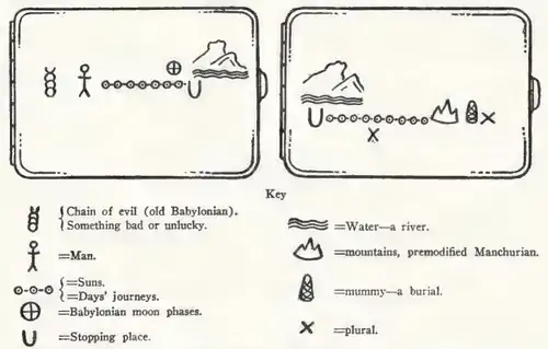 But as he peered sharply at the fine indentations his eyes brightened with interest. For although the river and the stopping-place symbols were repeated, and the string of tiny circles which signified the number of days' journeying, the plural sign was there just below them. At the end of the journey, mountains—but they were indicated by the conventional, premodified Manchurian symbol and, close by, the sign of a mummy.