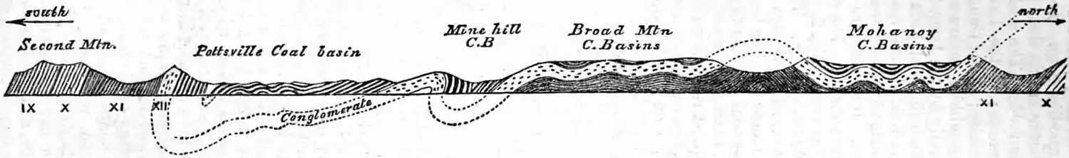 —The anthracites of Pennsylvania exist in four parallel coal fields, in the counties of Schuylkill, Carbon, Columbia, Northumberland, and Luzerne, embracing an area of 470 sq. m. Within these fields numerous parallel basins or synclinal troughs are formed by the peculiar undulations of the strata, which dip at every angle from horizontal to perpendicular. Fig. 2 represents the general grouping of the principal basins of the southern Pennsylvania anthracite field, and the eastern part of the middle field, without reference to local peculiarities and abrupt dips.