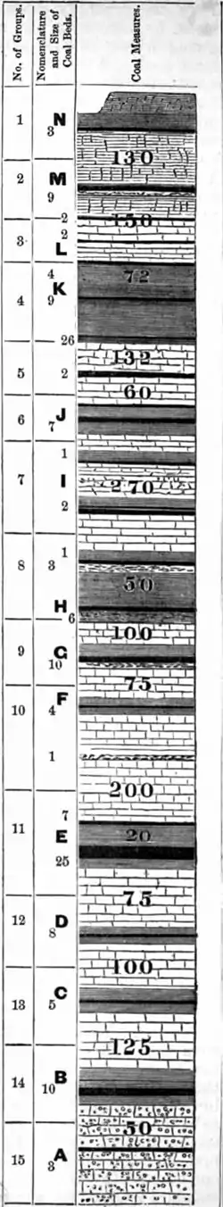 Coal was discovered in the Wyoming valley soon after its settlement, but the first authentic account which we find of the use of anthracite in the United States was in 1768-'9, when it was used by two blacksmiths from Connecticut named Gore. One of these brothers, Jude Obadiah Gore, related the facts to Judge Jesse Fell of Wilkesbarre, who subsequently communicated them to Silliman's “Journal” and Hazard's “Register.” In 1776 coal was quarried from the Baltimore bed near Wilkesbarre and the Smith mine near Plymouth, and taken down the Susquehanna in arks to the government arsenal at Carlisle. This trade was continued during the revolutionary war, and anthracite was used by the blacksmiths and gunsmiths of the lower Susquehanna from that time forth; but from the difficulty of making it burn it was not used for domestic purposes till 1808, when Judge Fell succeeded in burning “stone coal” in a grate of his own construction. Anthracite was sold in the vicinity of Wilkesbarre to the smiths at $3 a ton, and in Marietta, on the lower Susquehanna, at $8 to $9 a ton from 1810 to 1814. This was probably the first successful use of anthracite for general purposes in the world. The earliest record of the production of anthracite in France, as given by Taylor, is in 1814; while Mr. Blakewell, an English geologist, says the Welsh coals were “inferior” and not used for domestic purposes in 1813, and but “little used” in 1828.—The northern or Wyoming coal field is naturally divided into two regions, the Lackawanna and the Wyoming, and these into several districts. The Lackawanna region includes the districts on the Lackawanna creek, which empties into the Susquehanna at Pittston. The districts are the old or original Lackawanna, at and around Carbondale, the Scranton, and the Pittston. Around these centres the early developments of the Lackawanna region were made, and collieries clustered. The Carbondale district was opened in 1829 by the Delaware and Hudson company's canal and railroad; the Scranton district by the Delaware, Lackawanna, and Western railroad, in 1854; and the Pittston district by the Susquehanna canal in 1843, and the Pennsylvania coal company's railroad in 1850. The production of the Wyoming or northern coal field in 1871 was 6,481,171 tons. Of this amount 2,867,598 tons was sent from the Wyoming region, and 3,613,573 from the Lackawanna. There are now (1873) nine railroads and two canals employed in transporting coal from these regions. The coal beds in the Wyoming portion extend to K (fig. 1), but in the Lackawanna the number is less, extending only to H or I. The coal of the entire field is anthracite.—The first or southern and middle anthracite fields are the next in size and importance, and in order of development. Their topography and geology differ materially from the northern field, as shown by fig. 2 from Lesley. The valleys in which the coal exists are comparatively narrow, while both anticlinals and synclinals and the strata of the measures are more abrupt than those of the former. This field terminates in the east on the Lehigh river, in a single point or synclinal trough. In the west are two terminal points or prongs, which are wide apart at their extremities near the Susquehanna. Its extreme length is 73 m. to the end of the Dauphin or south fork, and 10 m. less by the Lykens Valley or north fork. Its mean breadth is 2 m., and its maximum, at Pottsville, 5 m. The number of coal beds is greater in this than in any of the other anthracite fields. The coal of the E. end is hard anthracite; of the Lykens Valley fork, semi-anthracite; and of Dauphin fork, semi-bituminous. The middle anthracite field is divided longitudinally by the Locust mountain anticlinal, over which the coal beds connect at several points. It is divided into two regions. The Mahanoy region is 25 m. long, with a mean breadth of nearly 2 m. Its basins are narrow and deep, and the strata abrupt. The Shamokin or northern part, not shown in fig. 2, is 20 m. long, with a mean breadth of 2½ m. The basins are wider, of less depth, and the strata of less inclination, than the former. The highest bed in this field is K. The coal is generally anthracite, except at the W. extremity, where it is semi-anthracite. The earliest records we find of the existence of coal in the southern and middle coal fields are those on Scul's map of Pennsylvania and Faden's “Atlas of North America” (1810-'17). The first discovery for practical purposes, however, was made in 1791 by a hunter named Philip Ginter on the Lehigh end of the southern coal field, and on the site of the since famous Lehigh coal quarry at Summit Hill. In the following year the “Lehigh Coal Mine Company” was formed by Robert Morris, J. Anthony Morris, Cist, Weist, Hillegas, and others, who secured 6,000 acres of land and opened the quarry the same year (1792) to test the character and value of the coal. In 1798 a charter was obtained by this company for a sluice navigation on the Lehigh, and in 1803 six arks with 600 tons of coal, from the Summit Hill quarry, were started down the river; but only two, with less than 100 tons each, reached Philadelphia. The city authorities purchased the coal to supply a steam engine used at the water works, then in Broad street; but it could not be made to burn, probably because it was tried in large lumps, and was broken up to gravel the walks of the grounds. In 1806 another ark load was taken to Philadelphia with no better success. It appears, however, from a brief account of “The Discovery of Anthracite on the Lehigh,” in the memoirs of the historical society of Pennsylvania, written by Dr. T. C. James of Philadelphia, who had visited the mines, that he had commenced using stone coal in the winter of 1804, and, having laid in a supply from this and the former cargoes, continued to use it to the day of publication in 1826. About this time (1800) William Morris, whose mines were near Port Carbo