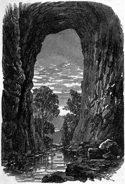The bed of the stream is more than 200 ft. below the surface of the plain, and the sides of the chasm, at the bottom of which the water flows, are composed of solid rock, maintaining a position almost perpendicular. The walls do not seem to be water-worn, but suggest the idea of an enormous cavern, that in remote ages may have been covered for miles by the continuation of that stratum of which all that now remains is the arch of the natural bridge. A plumb line dropped from its centre down the vertical face of the rocks swings clear at the depth of 40 ft., which is the thickness of the crown of the arch. Toward its sides this regularly increases with a graceful curve, as in an artificial structure. Its breadth is full 60 ft., and the stone is a highly silicious limestone, extremely hard to break, formed in massive blocks and strata, with no evidence upon its weathered surface of a tendency to decompose and crumble away. It is thus apparent that the insignificant little stream which now runs in this deep gorge has had no agency in shaping and producing this wonderful channel. Mightier forces have worn away the hard strata, more powerful torrents than any that now flow over the surface set in motion probably when this portion of Virginia was shaken by those great convulsions which displaced its piles of strata to the depth of thousands of feet, bringing into juxtaposition, along the line of fissures which are still to be traced, groups of rock everywhere else found separated by other formations, the aggregate thickness of which might be measured by miles. The mineral springs so common in this region, and particularly along the lines of these disturbances, flow up from great depths, as is made evident by the high temperature of many of them. Across the top passes a public road, and being in the same plane with the neighboring country, one may cross it in a coach without being aware of the interesting pass. There are several forest trees of large dimensions growing near the edge of the creek directly under the arch, which do not nearly reach its lowest part. The most imposing view is from about 60 yards below the bridge, close to the edge of the creek; from that position the arch appears thinner, lighter, and loftier. A little above the bridge, on the western side of the creek, the wall of the rock is broken into buttress-like masses, which rise almost perpendicularly to a height of nearly 250 ft., terminating in separate pinnacles which overlook the bridge. On the abutments of the bridge there are many names carved in the rock of persons who have climbed as high as they dared on the face of the precipice. Highest of all for nearly three quarters of a century was that of George Washington, who when a youth ascended to a point never before reached, but which was subsequently surpassed in 1818 by James Piper, a student in Washington college, who actually climbed from the foot to the top of the rock. II. In Walker co., Alabama, is a natural bridge said to rival that of Virginia. It is in the sandstone called millstone grit, which underlies the coal formation. It spans about 120 ft., and its height is about 70 ft. A smaller bridge connects it with the bluff beyond. The lines of stratification of the sandstone give the structure the appearance of having been artificially built up with massive blocks. It is in the midst of a region of wild and romantic beauty, high escarpments of the same sandstone being seen standing out in the face of the hills around. There is a similar bridge in Christian co., Kentucky, 130 ft. high, with a span of 70 ft. III. California has five natural bridges, the largest of which is on a small creek emptying into the Hay fork of the Trinity river, where a ledge of rock 3,000 ft. wide crosses the valley. Under this runs the creek, through an arch 20 ft. high by 80 ft. across. The rock above the arch is 150 ft. deep. On Lost river, in Siskiyou co., there are two natural bridges about 30 ft. apart. The rock is a conglomerate sandstone, and each bridge is from 10 to 15 ft. wide, while the distance across the stream is about 80 ft. One of these bridges is visited regularly by travellers. On Coyote creek, in Tuolumne co., 10 m. N. of Sonora, are two natural bridges, half a mile apart. The upper bridge is 285 ft. long with the course of the water, and 36 ft. high, with the rock 30 ft. deep over the water. The lower bridge is similar in size and height to the other.