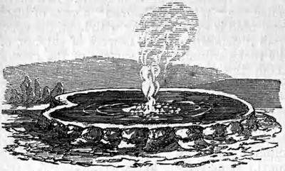 GEYSERS (Icelandic, geysa, to burst forth violently), intermittent hot springs found in various parts of the world. In Iceland the principal geysers are in the S. W. part of the island, about 35 m. N. W. of Hecla, and 70 m. from Reykiavik, the chief town. In a circuit of about two miles are more than 100 springs which send forth hot water, 50 or more in the space of a few acres. These are on the lower slope of a small hill of trappean rock, and above them in the steeper part of the hill under the cliffs of this rock are banks formed by the incrustations of ancient and now nearly extinct geysers. The springs are of different dimensions, and exhibit various degrees of activity; some are uniformly full and quiet, others are constantly boiling, and others only at intervals, with explosive discharges of water and steam. The vapors rising from them form clouds that are seen miles away. They are attended with sulphurous odors; and the geysers of other localities on the island deposit sulphur derived from the decomposition of the iron pyrites in the clays through which the hot waters penetrate. The chief spouting springs of the group are the Great geyser and the Great and Little Strokr. The Great geyser when quiet presents the appearance of a circular mound of silicious incrustations, enclosing a pool, with sides sloping inward at an average angle of 13°, and outward at a mean inclination of 8°. The height of the mound is about 20 ft. on the lower side, but only half as much on the upper side. The diameter of the basin varies from 50 to 60 ft., and its average depth is 4 ft. In its centre is the mouth of the vertical tube which connects it with the subterranean passages. This tube is about 9 ft. in diameter at its mouth, and 70 ft. in depth. When the geyser is inactive, the basin is filled to the edge with clear water, which has a mean temperature of 185° F. and runs gently down the mound, emitting clouds of steam; but for several hours after an eruption the tube is empty to the depth of 4 or 5 ft. At intervals of about an hour and a half a rumbling noise is heard, and the water heaves up in the centre, throwing an increased quantity over the margin. The great eruptions take place at irregular intervals, sometimes exceeding 30 hours. At these times loud explosions are heard beneath the surface, the water is thrown into violent agitation, it boils furiously, and at last is suddenly sent forth in a succession of jets, which increase in force till they become an immense fountain that is lost to view in the clouds of steam in which it is enveloped. The heights reached by these jets have been variously estimated by different travellers. The lowest estimate is 60 or 70 ft.; that of Von Troil in 1772 is 92 ft.; of Sir John Stanley in 1789, 96 ft.; of Lieut. Ohlsen, a Danish officer, in 1804, determined by a quadrant, 212 ft.; of Sir George Mackenzie in 1810, 90 ft.; and of Henderson in 1815, 150 ft. Later visitors, Lord Dufferin, Mme. Ida Pfeiffer, J. Ross Browne, and others, estimate the height at from 60 to 70 ft. The eruptions appear to be diminishing in force and frequency, and it is not improbable that they will cease altogether before the lapse of another century. The discharge continues only about five minutes, when the geyser subsides to a state of tranquillity. The Great Strokr, so named either from the Icelandic word meaning churn, or from stroka, to agitate, is only 300 or 400 ft. from the Great geyser, from which it differs in appearance in being an irregularly formed well, incrusted with silicious deposits, but having no basin at its mouth. Its orifice is about 8 ft. in diameter, diminishing to about 10 in. at the depth of 27 ft.; the whole depth is a little over 44 ft. The water for the greater part of the time is 10 or 12 ft. below the surface, and is continually boiling and seething, but at intervals of about half a day it breaks forth in a great eruption, throwing its water generally from 40 to 60 ft.; but Bunsen, who saw it in 1846, estimates it to be 151 ft. high. By throwing turf or stones into the well of the Strokr, an eruption can be brought on in a few minutes. The Little Strokr exhibits the same phenomena on a smaller scale. In the same vicinity are two large and quiet wells remarkable for their beautifully blue water. These were once active, and one of them is described by an English traveller as the Roaring geyser. It became tranquil immediately after an earthquake in 1789, when the Great Strokr first broke forth. The deposits of silica which accumulate around the geysers are derived from the small amount of this material which is taken up in solution by the hot water. By the analysis of Dr. Black, made upon 10,000 grains (about 5⅓ gills), it would appear that the whole amount of solid matter remaining dissolved in the cold water is only a little more than 1⁄1000 of the whole, the quantity examined yielding as follows: soda, 0.95; alumina, 0.48; silica, 5.40; muriate of soda, 2.46; dry sulphate of soda, 1.46; in all, 10.75. An analysis of the geyserite, or solid deposit, made by Forchhammer, gave the following result: silica, 84.43; water, 7.88; alumina, 3.07; iron, 1.91; lime, 0.70; soda and potassa, 0.92; magnesia, 1.06; total, 99.97. As the water evaporates and is chilled, the excess of silica is added to the surface around, filling the interstices of the mosses and grass, and making of these silicious petrifactions, while the living plants still thrive and shoot above the strong substance that binds together their roots and stems. Where the waters are found at a temperature of 98° C. (208.4° F.), M. Descloiseaux observed that the confervæ still flourished. The true theory of the cause of geyser eruptions is due to Bunsen. When in Iceland in 1846, he proved by a series of careful experiments that the temperature of the water in the geyser tube varies at different depths, as also at different periods between two eruptions, the changes always taking place in the sa
