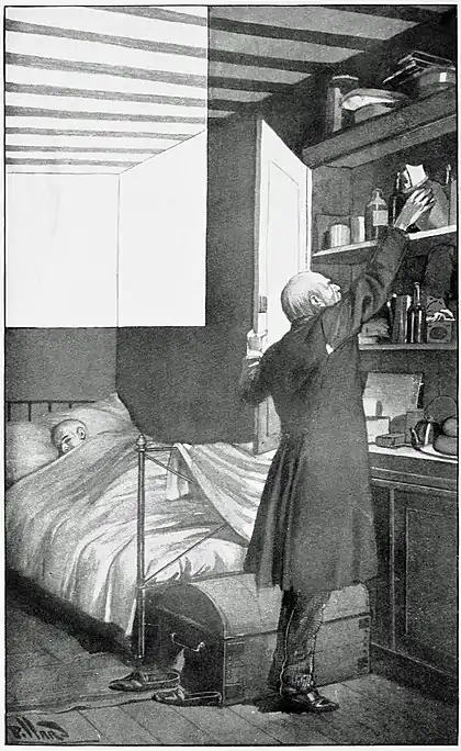 The front door being shut, and Sinclair probably not yet returned, he entered the house by a way familiar to the inmates—a latched door giving on to the wharf. The clock told him that he had been gone nearly an hour, but Sinclair was still absent. When he entered old Cater's room upstairs he found a great change. The old man lay in a state of collapse, choking with a cough that exhausted him; and for this there seemed little wonder, for the window was open, and the room was full of the cold air from the river.
