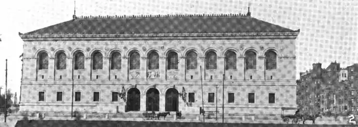 The second great change in the outward aspect of Boston resulted from the great fire of 9 and 10 Nov. 1872. From the beginning of its history Boston had been afflicted by serious fires. This greatest of them all destroyed 776 buildings, all but 67 of which were of brick and stone. It devastated Summer street (both sides), Washington street from Summer to Milk, Milk street to the post office, Devonshire street, Water (both sides), Congress, Lindall and Oliver streets to the harbor. From the corner of Washington and Franklin streets the shipping at the wharves was in clear view. Nearly 2,000,000 feet of land were burned over. The total loss was estimated at more than $75,000,000. Yet by private enterprise and State aid the recovery was immediate. The opportunity to widen and straighten streets in the business district was seized. Statelier buildings rose in the place of those destroyed, and a new business region, corresponding to the new district of residences, was created.