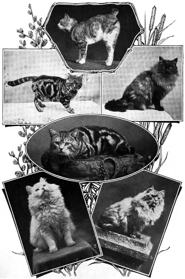 American Interest in Cats.— American interest in the cat is often said to have originated within the last 20 years, that is, since the advent of exhibitions and the taking up of the cat-cult by the public. This impression is not borne out by facts, for we have exhibitors who have intimately studied cats, have bred and raised them, and have cared for them for over 60 years, and cat-shows were held in Maine between 1860 and 1870, even before the great exhibition instituted in London by the well-known animal painter, Harrison Weir, in the year 1871. But cat shows in America were not known outside of Maine until one was held in the Madison Square Garden, New York, in 1895. The exhibitions in England have gone on from Mr. Weir's first show up to the present time, so that the marking epochs in modern cat history may be dated from the Crystal Palace show in 1871, and the New York show in April 1895. From these shows has arisen what may be described as a cult, or in some ways an industry. Numbers of individuals, principally women, have taken up the cat as a partial means of livelihood, selling those they rear by exhibiting them to the public, the outcome of which has been the production of different colors, strains and families. Clubs have arisen for the care and maintenance of exhibitions; registers and stud-books have been started; and the importance of cats of known pedigree is duly recognized by our government as one of the many things to be considered and provided for in a tariff schedule.
