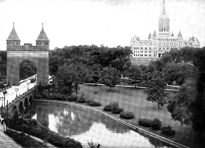 The State Capitol and Soldiers and Sailors' Memorial Bridge and Arch, in Bushnell Park
