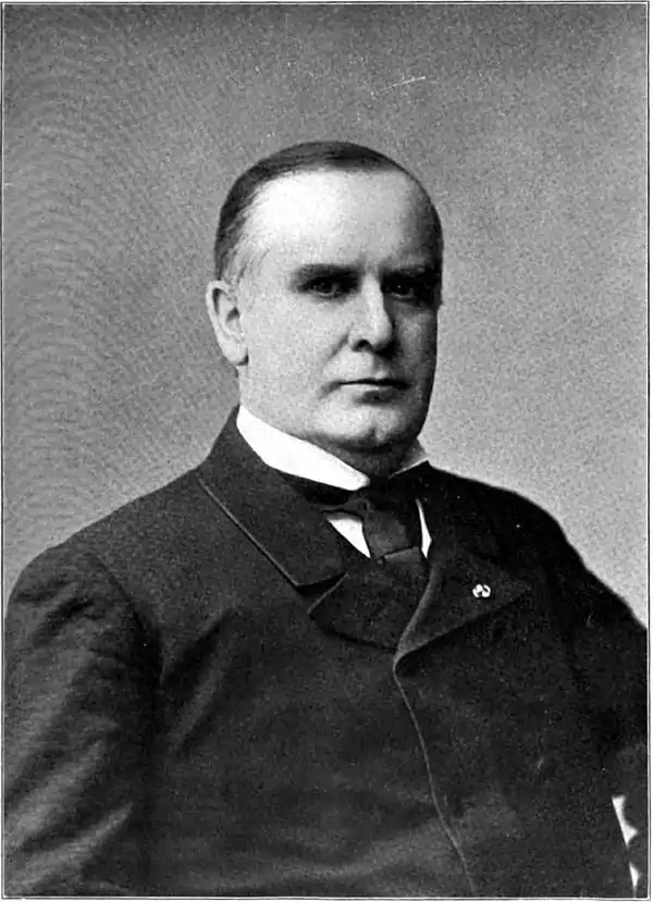 McKINLEY, mạ-kĭn'lĭ, William, American statesman, 25th President of the United States: b. Niles, Trumbull County, Ohio, 29 Jan. 1843; d. Buffalo, N. Y., 14 Sept. 1901. He was educated at Union Seminary, Poland, Mahoning County, Ohio, and Alleghany College, Meadville, Pa. (1860-61). Forced by illness to discontinue his college course, he taught in the public schools, was a clerk in the Poland post-office and on 11 June 1861 enlisted for the Civil War as a private in Company E of the 23d Ohio Volunteer Infantry. His first battle was that of Carnifex Ferry (10 Sept. 1861), and on 15 April 1862, while in camp at Fayetteville, western Virginia, he was promoted commissary sergeant. For conspicuous service at Antietam (17 Sept. 1862) he was made second lieutenant of Company D. His subsequent appointments were, first lieutenant, Company E (7 Feb. 1863); captain Company G (25 July 1864); and brevet major (14 March 1865). When mustered out on 26 July 1865 he was acting assistant adjutant-general on the staff of Gen. S. C. Carroll, commanding the veteran reserve corps stationed at Washington. Among other actions in which he participated were those of South Mountain (14 Sept. 1862), Lexington (10 June 1864), Kernstown (24 July 1864), Opequan Creek (Winchester, 19 Sept. 1864), Fisher's Hill (22 Sept. 1864) and Cedar Creek (19 Oct. 1864). During his subsequent political career he was generally known, especially in Ohio, as Major McKinley. At the close of the war he began the study of law at Youngstown, Ohio (1865-66), continued it at the Albany (N. Y.) Law School (1866-67), in March 1867 was admitted to the bar at Warren, Trumbull County, Ohio, and at once entered practice at Canton. In 1870-71 he was prosecuting attorney of Stark County, and during the campaign between R. B. Hayes and William Allen for the governorship of the State, spoke effectively against the “greenback” craze. He was elected to Congress as Republican representative from the 17th Ohio district in 1877, and served continually in the 45th, 46th and 47th Congresses (1877-83). It was asserted by the Republicans that he was elected in 1882 to the 48th Congress by a majority of eight ballots; but, although he had received the certificate of election, his seat was successfully contested by J. H. Wallace, who was not, however, seated until June 1884. He represented the 20th district in the 49th Congress (1885-87), and the 18th in the 50th and 51st Congresses; but in 1890 was defeated in the 16th for the 52d Congress by 300 ballots by J. G. Warwick, Democrat, lieutenant-governor of the State a short time previously. His defeat was attributed to the gerrymandering of the district by a Democratic legislature. His service in Congress was notable. In 1877 he was appointed a member of the Judiciary (Committee, and in December 1880 of the Ways and Means Committee to succeed James A. Garfield; and in 1881 was chairman of the committee in charge of the Garfield memorial exercises in the House. In 1889-90 he was chairman of the Ways and Means Committee. He was a candidate for speaker of the 51st Congress, but was defeated by T. B. Reed on the third ballot in the Republican caucus. He was known among the foremost orators of the House; and his speeches on arbitration as a solution of labor troubles (2 April 1886) and in support of the civil service laws (24 April 1890) were most favorably received. But his principal efforts were made in connection with the tariff, which, from his first appearance in the House, was the chief object of his study. On 6 April 1882 he spoke in advocacy of protection; on 30 April 1884 in opposition to the Morrison tariff bill, making what was esteemed the ablest argument against that measure; and on 7 May 1890 in support of the general tariff hill, now known by his name, which, as chairman of the Ways and Means Committee, he had introduced before the House on 16 April. The bill was passed by the House on 21 May, by the Senate on 11 September, and on 6 October became a law. His bill obtained for him an international reputation, and eventually the Presidency. In 1884 he was delegate-at-large from Ohio to the Republican National Convention at Chicago, where he supported Blaine's candidacy, and where, as chairman of the committee on resolutions, he helped to determine the platform of his party, which he read before the convention. In the Republican National Convention at Chicago in 1888, he was again a delegate and chairman of the committee on resolutions. He supported the candidacy of John Sherman, although, when it was finally learned that Blaine would decline the nomination, he was himself the choice of many delegates and was strongly urged to permit the use of his name. At the Minneapolis convention of 1892 he was once more a delegate and was elected permanent chairman of the assembly. He supported the renomination of President Harrison, and though refusing the use of his own name, received the ballots of 182 delegates. He then left the chair and moved to make Harrison's nomination unanimous, which was accordingly done. In the ensuing campaign he took a very active part, traveling, it was estimated, more than 16,000 miles and speaking to more than 2,000,000 voters. In 1892-96 he was governor of Ohio, having been elected in 1891 by 21,500 plurality, and in 1893 by the unusual plurality of 80,995. Labor riots occurred during his administration, necessitating the placing of 3,000 militia troops in active service, but the difficulties were successfully adjusted. McKinley also personally directed the relief work for the starving miners of the Hocking Valley district. He was nominated for the Presidency by the Republican National Convention which met at Saint Louis 16 June 1896, and was elected by a plurality of 601,854 over W. J. Bryan, receiving a popular vote of 7,104,779, and in the electoral college a vote of 271 to 176 for Bryan. Throughout the campaign he remained in Canton, where be made over 300 speeches to more