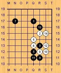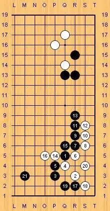 Black has the corner and White has commenced to envelop his stones. The following continuation might occur:
