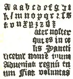 The other fragment in this type is a little pamphlet of eight pages, printed on parchment and upon one side only. It is described by some as a Horarium, or a little book of prayers; by others as an Abecedarium, or a child's primer. It contains the Alphabet (all the small letters but not the capitals), the Lord's Prayer, the Ave Maria, the Apostles' Creed, and two prayers. The Alphabet has the k, a letter that was not used in the Latin language; it has no w, this letter being formed by the union of the two characters v. Holtrop says that the types seem to have been made for the Dutch language.