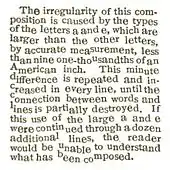 Illustration of Types of Irregular Body.There is something more in types than is apparent at the first glance. Simple as they may seem, they are evidences of notable mechanical skill in the matter of accuracy. The page before the reader was composed with more than 2,000 pieces of metal; the large page of a daily paper may contain more than 150,000 of these little pieces. Whether the page is large or small, the types are always closely fitted to each other; they stand accurately in line, and the page is truly square. If the types of one character, as of the letter a, should be made the merest trifle larger or smaller than its fellows in the same font, all the types, when composed, will show the consequences of the defect. The irregularity of line that is scarcely perceptible in the first row will be offensively distinct in the second. It will increase with each succeeding row, until the types become a heap of confusion which cannot be handled by the printer. Advantages which might be secured from movable types are made of no effect by an irregularity so slight that it would be passed unnoticed in the workmanship of ordinary trades. The illustration proves that it is not enough for types to be movable; they must be accurate as to body; they must fit each other with geometrical precision.