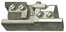 Figure 1. Type-Mould, without Matrix and with a Type in the Mould.would lead to fatal faults in inaccuracy of body. Exactness of body can be had only by casting all the characters in one mould, but this mould must be made to suit all the matrices. The matrices must be frequently changed, but with such nicety that the types of every letter shall be uniform in height, in line, and truly square. Any mechanic will see that the construction of an adjustable mould is work of difficulty, and that the fitting-up of a set of matrices for one mould is a very nice operation.