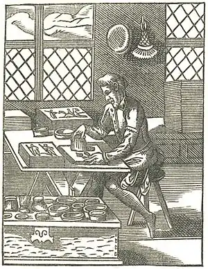 The illustration of the engraver on wood which appears in the same Book of Trades puts before us a man in a richer dress, plainly a workman of higher grade than the stencil painter. He seems to be tracing outlines on the block. The technical accessories about this engraver are the same as those in use at this day—the graver, the whetstone, and, possibly, a water globe lens in the corner near the window casement.[7]