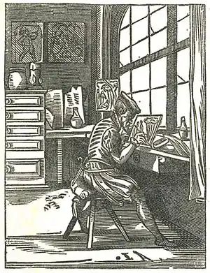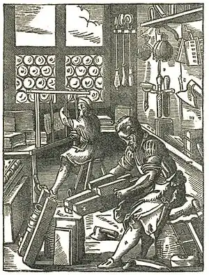[From Jost Amman.]The annexed illustration of bookbinding, published by Amman in his Book of Trades, puts before us many of the implements still in use. The forwarder, with his customary apron of leather, is in the foreground, making use of a plow-knife for trimming the edges of a book. The lying-press which rests obliquely against the block before him contains a book that has received the operation of backing-up from a queer-shaped hammer lying upon the floor. The workman at the end of the room is sewing together the sections of a book, for sewing was properly regarded as a man's work, and a scientific operation altogether beyond the capacity of the raw seamstress. The work of the finisher is not represented, but the brushes, the burnishers, the sprinklers and the wheel-shaped gilding tools hanging against the wall leave us in no doubt as to their use. There is an air of antiquity about everything connected with this bookbindery which suggests the thought that its tools and usages are much older than those of printing. Chevillier says that seventeen professional bookbinders found regular employment in making up books for the University of Paris, as early as 1272. Wherever books were produced in quantities, bookbinding was set apart as a business distinct from that of copying.The poor students who copied books for their own use were also obliged to bind them, which they did in a simple but efficient manner, by sewing together the folded sheets, attaching them to narrow parchment bands, the ends of which were made to pass through a cover of stout parchment, at the joint near the back. The ends of the bands were then pasted down under the stiffening sheet of the cover, and the book was pressed.