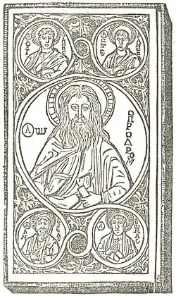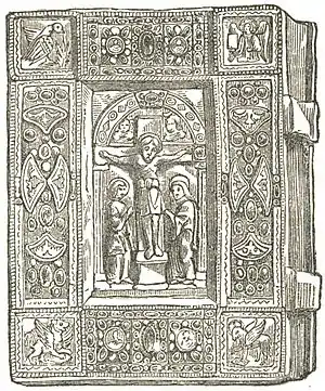 - ↑ This is one of the finest existing specimens of antique bookbinding in the National Library at Paris. It is a work of the eleventh century, and encases a book of prayers in a mass of gold, jewels and enamels. The central object is sunk like a framed picture, and represents the Crucifixion, the Virgin and St. John on each side of the cross, and above it the veiled busts of Apollo and Diana; thus exhibiting the influence of the older Byzantine school, which is, indeed, visible throughout the entire design. This subject is executed on a thin sheet of gold, beaten up from behind into high relief, and chased upon its surface. A rich frame of jeweled ornament surrounds this object, portions of the decoration being further enriched with colored enamels; the angles are filled in with enameled emblems of the evangelists; the ground of the whole design enriched by threads and foliations of delicate gold wire. Chambers, Book of Days.