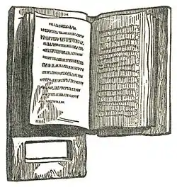 - ↑ These boards were sometimes paneled from the inside of the cover, Scaliger tells us that his grandmother had a printed psalter, the cover of which was two fingers thick, containing in an interior panel a silver crucifix. Hansard says that he had seen an old book which contained in a similar recess a human toe, obviously a sacred relic of value.