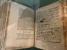 Newton's personal copy of the first edition of Philosophiæ Naturalis Principia Mathematica, annotated by him for the second edition. Displayed at Cambridge University Library.