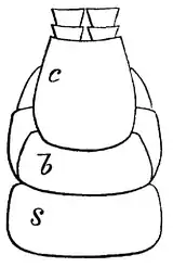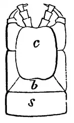 Fig. 2Close to the spiracles, and belonging to the dorsal section, are two osseous points, the rudiments of the paraptera, which attain to some importance among the Hexapoda. At the insertion of the legs are several small plates, the epimera (Fig. 2, c) , which afford points of origin to the retractor muscles of the legs. The posterior of the two embryonic sub-segments forms the mass of the segment; but the scutum of the anterior is perhaps represented by a raised band on the front of the main scutum. The ventral portions of it are, however, much more distinct. These are a series of small plates anterior to the sternum, representing the two parts of the primitive