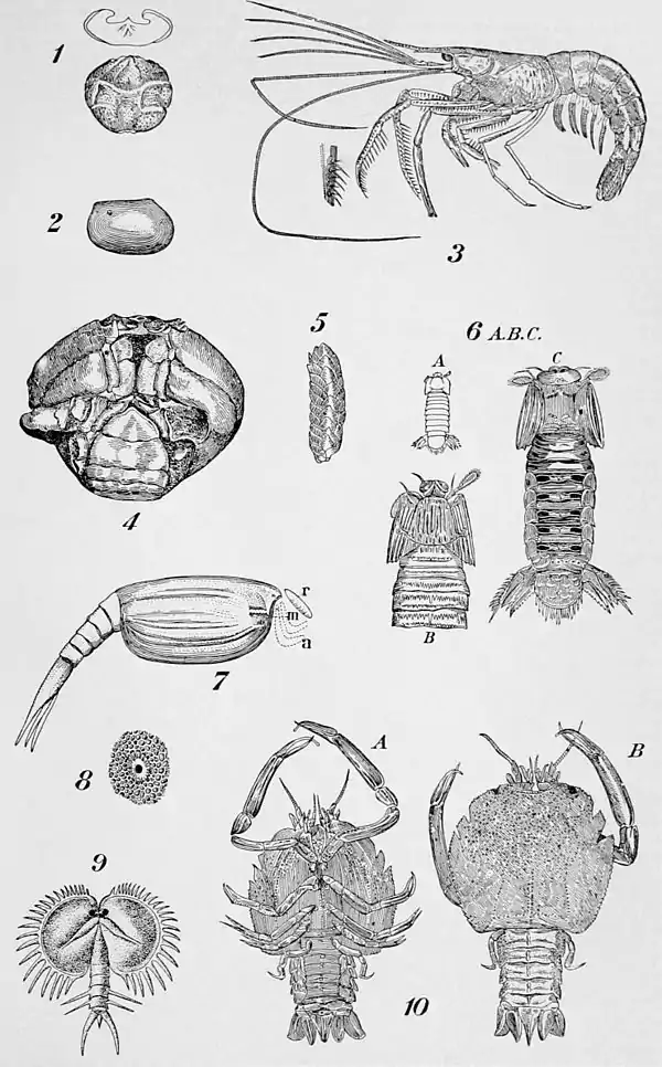 II. Entomostraca. The members of this subclass present a great variety of form and habit of life, but they are alike in the variability of the degree of segmentation of the body. They are with few exceptions small, and all are aquatic. They are divided into four orders. (1) In the order Phyllopoda the segmentation is distinct, the anterior portion of the body is covered by a cephalic shield, and the thoracic appendages are leaf-like, this latter character giving the group its name. In some phyllopods, as Apus, and the brine-shrimps (Branchipus and Artemia), the body is elongated, well segmented, partly covered by a single dorsal shield and divided into three regions. In other genera, as Daphnia and Estheria, the body is not well segmented and is inclosed in a bivalve shell articulated by a hinge at the dorsal median line. The phyllopods are doubtfully represented in the Cambrian rocks. One genus, Estheria, has enjoyed a remarkably long life-period, since it has existed from Devonian to recent times. During the Devonian and Carboniferous periods the Phyllopoda abounded in the brackish waters of the coastal swamps; in the rocks of the Tertiary era the members of this order are less common. A single doubtful representative of the suborder Cladocera, the genus Lynceites, has been found in the Carboniferous rocks. (2) Ostracoda.—In this order the animals are all small, mostly microscopic, and with the body inclosed in a hinged bivalve shell that can be tightly shut by a specially developed adductor muscle. These animals occur by myriads in the modern ocean, seas, and lakes, mostly swimming near the surface of the water, and they seem to have lived in equal abundance in the seas of past time, for their fossil shells are common in all the aqueous rocks from those of Cambrian to those of recent time. Their greatest expansion was in the Ordovician and Silurian, and again in the Carboniferous and Cretaceous periods. Examples are Beyrichia, Leperditia, and Cypris. (3) Copepoda.—These are all recent forms, with elongated well-segmented bodies in all except the degenerate parasitic members of the order. The limbs of the free-swimming species are biramous; those of the parasites are greatly reduced in size or entirely wanting. Examples: The water-flea (Cyclops), the fish-lice (Lernæa), and carp-lice (Argulus). (4) Cirripedia.—In this order, the barnacles, we see perhaps the most aberrant of all crustaceans. Because of the usual sessile habit of life, the body of the animal has suffered so great modification that only the study of the developmental stages shows that the peculiar forms of the adult barnacles are acquired after passing through a series of larval stages exactly parallel to those of other Entomostraca. The body of the adult is attached by the head. It is inclosed in a leathery integument that develops articulated calcareous plates and is raised upon a peduncle as in the goose-barnacle (Lepas); or it may be contained in a calcareous box made of a series of stony plates firmly joined to each other and to the foreign object that serves as a support, as in the acorn-shell (Balanus). The earliest members of the order, Turrilepas and Plumulites, appeared in Cambrian and Ordovician time, and were ancestors of Lepas, while the oldest relative of Balanus, namely Palæocreusia, occurs in the lower Devonian rocks, and the genus Balanus itself has been found in the Mesozoic and Tertiary deposits. The Cirripedia afford the largest examples of Entomostraca in some of the goose-barnacles that attain a length of eight or nine inches, and they furnish also the most degenerate forms in those Rhizocephala that live as parasites in the bodies of crabs. See Barnacle; Copepoda; Ostracoda; Phyllopoda; Entomostraca; and Plate of Barnacles.