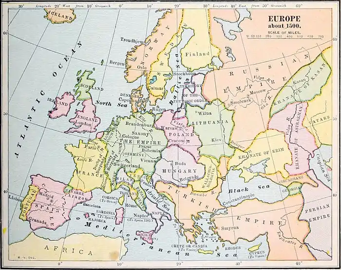 History. — I. Adams, Manual of Historical Literature (New York, 1899); II. General Histories. Of brief manuals, consult: Adams, European History (1899); Duruy, General History (1898); Hassall, Handbook of European History (1897); Ploetz, Epitome of Ancient, Mediæval, and Modern History (1883); Robinson, History of Western Europe (1902); Thatcher and Schwill, History of Europe, Andrews, Brief Institutes of General History (1887), and Lavisse, General View of the Political History of Europe (1891), discuss principles and tendencies, but give little narrative of events. Of larger works, the best is Lavisse and Rambaud, Histoire générale du 4 siècle à nos jours (12 vols., Paris, 1893-1901); the last volume reaches 1900. See also Oncken, Allgemeine Geschichte; the last volume treats of the time of Emperor William, and was published in 1893. Helmolt, History of the World, is in course of publication; volumes four to eight will treat of Europe. Other series are the Periods of European History, edited by Dyer and Hassall (10 vols., 1453-1900); Epochs of Modern History, published by Scribner (18 vols.); The Cambridge Modern History, planned by Lord Acton, in preparation (12 vols. in all; Vol. I., The Renaissance, 1902). III. The Middle Ages. Adams, Civilization During the Middle Ages (New York, 1897); Bryce, The Holy Roman Empire (London, 1877); Bury, The Later Roman Empire, 395-800 A.D. (2 vols., New York, 1889); Duruy, History of the Middle Ages (New York, 1891); Emerton, Introduction to the Study of the Middle Ages (Boston, 1888); ib., Mediæval Europe (Boston, 1894); Gibbon, Decline and Fall of the Roman Empire, first published 1776-81, best edition by Bury (7 vols., 1900-02); Munro, History of the Middle Ages (1902); Stillé, Studies in Mediæval History (Philadelphia, 1882); Taylor, Classical Heritage of the Middle Ages (New York, 1901). IV. The Renaissance. Burckhardt, Civilization of the Renaissance in Italy (London, 1878); Symonds, The Renaissance in Italy (7 vols., new edition 1897-98). V. Modern History. Duruy, History of Modern Times from the Fall of Constantinople to the French Revolution (New York, 1894): Dyer, History of Modern Europe, 1453-1857, edited by Hassall (London, 1901 et seq.); Lodge, History of Modern Europe, 1453-1878 (New York, 1885); Schwill, History of Modern Europe (1902); Schlosser, History of the Eighteenth Century (8 vols., London, 1843-52); Lacroix, The Eighteenth Century (London, 1876); Sorel, L'Europe et la Révolution française (Paris, 1892); Alison, History of Europe, 1789-1852 (Edinburgh, 1853); Cayley, The European Revolution of 1848 (London, 1856); Rose, A Century of Continental History, 1780-1880 (London, 1899); Fyffe, History of Modern Europe from 1792 to 1878 (New York, 1890); Seignobos, Histoire politique de l'Europe contemporaine, 1814-96 (Paris, 1897); Stern, Geschichte Europas seit den Vertragen von 1815 (Berlin, 1894-1901); Andrews, Historical Development of Modern Europe, 1815-97 (New York, 1900); Müller, Political History of Recent Times, 1816-75 (New York, 1882); McCarthy, History of Our Own Times, from the Accession of Queen Victoria to 1880 (4 vols., London, 1880); May, Democracy in Europe (New York, 1877); Freeman, The Historical Geography of Europe (London, 1881).