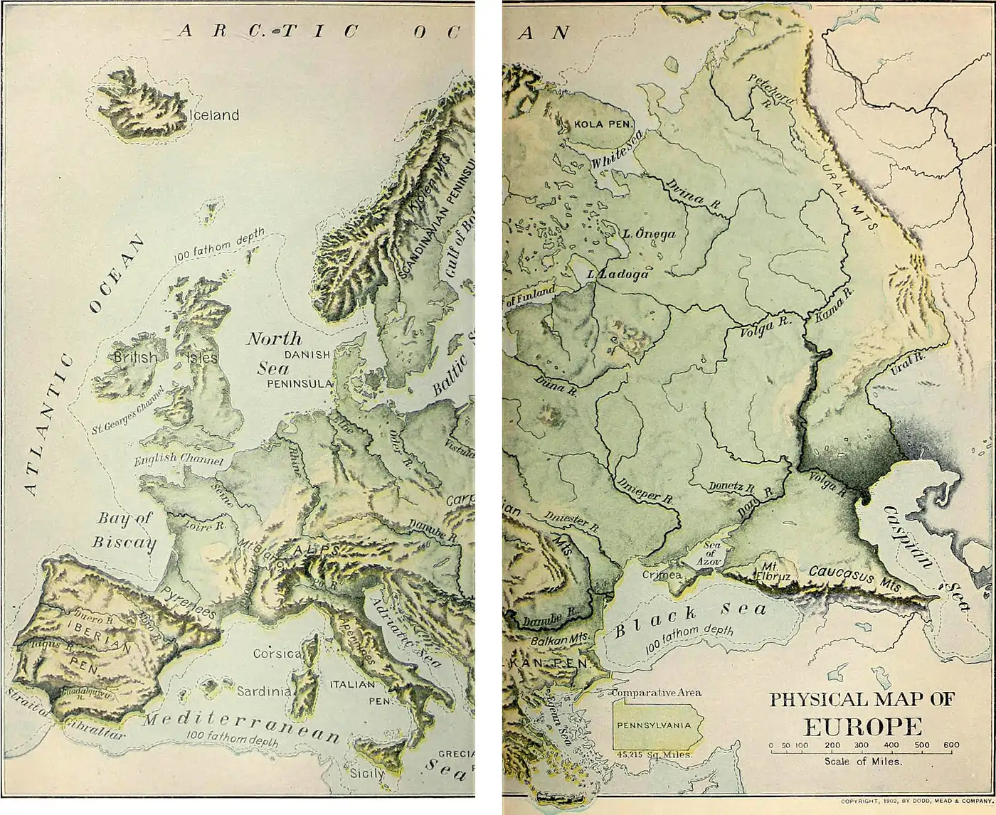 Generalizing these facts as to the topographic forms of the continent, it may he said that Europe is divided into two parts, the eastern part Russia, and the western part the remainder of the continent. The eastern part is an unbroken lowland, mountains rising only on its eastern and southern edges. The western part has with its plains also the two forms of mountain lands above mentioned. The eastern part is broad, massive, little articulated; or, in other words, it is not made up of connected segments. It suggests North Asia, from which it is projected. The western part is narrow, richly articulated, open everywhere to the influences of the sea. The character of the eastern part is uniformity; that of the western part, diversity.