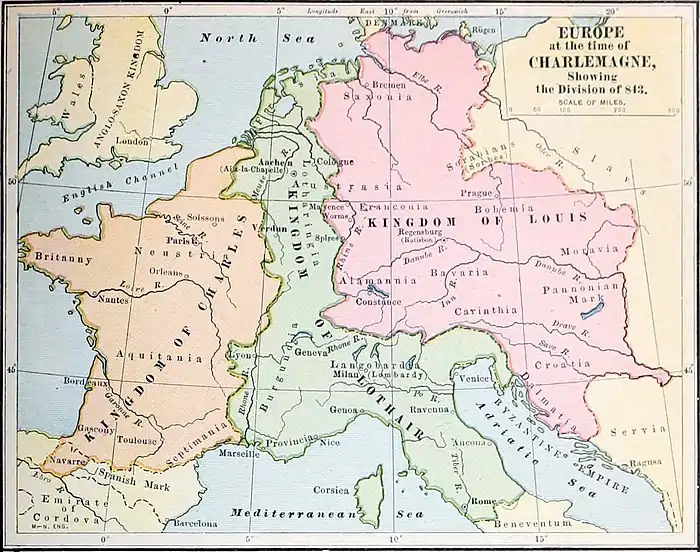 The Frankish Empire and the Papacy. The great German-Gallic kingdom which the Franks had built up in the fifth and sixth centuries was threatened, in the seventh century, with dissolution. The royal power was hereditary, but all the sons of the King had equal rights of inheritance. The resulting partitions were indeed temporary; by wars and by murders the realm was repeatedly reunited; but in these struggles the territorial magnates gained increasing independence, while the degeneracy of the reigning house diminished its authority. (See Merovingians.) The power that was slipping from the hands of the Merovingians was, however, grasped by new rulers. Arnultings or Carolingians (q.v.), who, first as mayors of the palace, later as kings, reëstablished the royal power, and in the eighth century widened the Frankish kingdom into a European empire. As in the earlier stages of Frankish expansion, the acquisition of new Romanic territory (Italy and northeastern Spain) was balanced by conquests of other German tribes (Frisians and Saxons). Even more than the Merovingians, the Carolingians identified their dynastic interests with those of the orthodox Christian Church. They carried the Gospel among the heathen Germans with the sword, converting as they conquered. They drove the Arabs back across the Pyrenees (see Charles Martel and Pepin the Short under Pepin), and extended the boundary of Christendom to the river Ebro. Throughout their realms, they supported with ready assistance the supreme authority of the popes in ecclesiastical discipline; and when they interfered to protect him against the Lombards they recognized him as ruler over a strip of central Italy, reaching from Ravenna to Rome, and thus laid the basis of the temporal power which the popes held until 1870. (See Donation of Pepin; Papal States.)