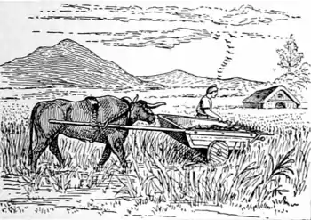 The mower developed simultaneously with the reaper. In fact, many of the earlier machines were designed to be used either as a mower or as a reaper. A separate machine for cutting grass was patented as early as 1812 by Peter Gaillard of Pennsylvania. Hussey's original machine was really a mower, being built on principles afterwards adopted and developed in the construction of mowers. The most prominent name connected with the early development of mowers is that of W. F. Ketchum, who patented in 1847 a mower of simple design, having a single driving wheel. After the adoption of the Hussey type of cutter this machine proved a very successful mower of the rigid bar class. The first patent for a mower of the flexible bar type was granted to Cyrenus Wheeler in 1854. The flexible bar idea was further developed in a machine invented by Jonathan Haines in 1855. This had two drive wheels and a cutter bar jointed to the main frame in such a manner that it could be lifted over obstructions. In 1856 Aultman & Miller patented a machine which contained practically all of the essential features of the successful modern mower, viz. two driving wheels (the best types of modern reapers have one), the flexible cutter bar, with rapidly reciprocating blades, having smooth-edge sections, which was so hinged to the main frame that it could be raised and folded over against the latter when the machine was not in use. While combined reapers and mowers are still made, separate machines for the two purposes are considered preferable. The modern reaper has been adapted to the harvesting of all crops, such as maize, rice, peas, etc., and modified to meet all sorts of conditions, and has enormously decreased the labor involved in harvesting. Consult: Ardrey, American Agricultural Implements (Chicago, 1894); Stephens, The Book of the Farm, vol. ii. (Edinburgh and London, 1871); Scott, Texthook of Farm Engineering (London, 1885); Swift, Who Invented the Reaper? (Chicago, 1895); Stabler, Overlooked Pages of Reaper History (ib., 1897); Official Retrospective Exhibit of the Development of Harvesting Machinery at the Paris Exposition, 1900, United States Department of Agriculture Office of Experiment Stations, Bulletin 103.
