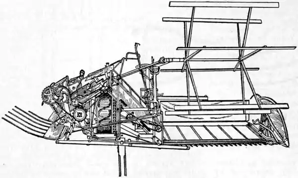 The first recorded attempt to bind grain by machinery was made by John E. Heath of Ohio, who obtained a patent in 1850, which was for a twine or cord binder. Other patents rapidly followed for machines using cord, straw, and wire. The most practical of these earlier machines, although not strictly a binder, was that known as the Marsh harvester, patented in 1858, in which the cut grain was elevated to a receiving box from which it was taken and bound by two men riding on the machine. This machine contained many features of the modern binder, especially the delivery of the grain by a canvas carrier over the drive wheel as distinguished from the ‘low-down’ type in which the binding device was attached to the self-rake. In 1864 Jacob Behel invented the knotting bill, which, with slight modifications, is used in almost all modern binders. In the meantime various fairly successful wire-binding machines were put on the market by different manufacturers, but in 1875 John F. Appleby, who had invented a successful twine knotter as early as 1859, made a binding apparatus, which with subsequent improvements furnished the basis for the binding apparatus of almost all modern binders, which are essentially a combination of this binding device with the Marsh type of harvester.