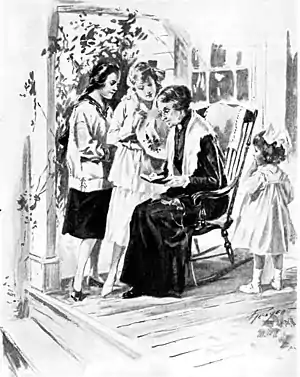 Sally called to Genevieve, who was playing in the boat on the beach below, and that young lady soon came scrambling up the bank. Hand in hand, all three started to the home of Miss Camilla, and, when they had reached it, found her sitting on her tiny porch knitting in apparently placid content. But true to Doris's observation, there were anxious lines in her face that had not been seen a month ago. She greeted them, however, with real pleasure, and, with her usual hospitality, proffered refreshments, this time in the shape of some early peaches she had gathered only that morning.