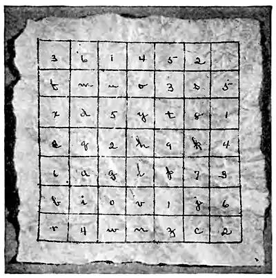"I have it! At least, I think I'm on the right track. Just examine this code a moment, Miss Camilla. If you notice, leaving out the line of figures at the top and right of the whole square, the rest is just the letters of the alphabet and the figures one to nine and another 'o' that probably stands for 'naught.' There are six squares across and six squares down, and those numbers on the outside are just one to six, only all mixed up. Don't you see how it could be worked? Suppose one wanted to write the letter T. It could be indicated by the number 5 (meaning the square it comes under according to the top line of figures) and 1 (the number according to the side line). Then 51 would stand for letter T, would n't it?"