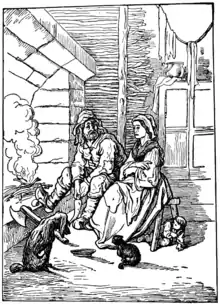 The Ogre's wife, who believed she could hide them from her husband till morning, let them come in, and took them to warm themselves at a very good fire; for there was a whole sheep roasting for the Ogre's supper.