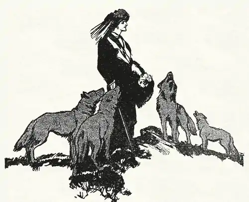 But it was not by that white face I knew her, nor by the wonderful eyes. Her attendants introduced her to me as they rose with pricked ears from where they lay about her feet—four great, gray wolves, yawning elaborately, observing us with oblique, half-closed eyes, without fear as without dislike. A turn of her hand sent them padding a few paces behind her—one, the biggest, it seemed to me, jealously reluctant. But he went, looking sideways at us with eyes that for a moment I saw wide and lambent.