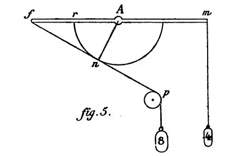- "In whatever part that the cord nc (fig. 7) be linked from the part ac, that does not make a difference, because one always employs a line which falls perpendicularly from the center of the balance to the line of the cord, that is to say, to the line mf."