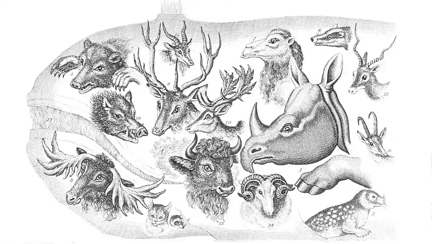 HEADS, &C. OF QUADRUPEDS, UPON AN OUTLINE OF THE HEAD OF THE GREAT WHALE. | |||
