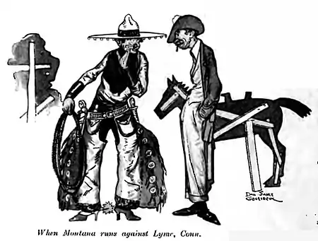 There is hardly one of there book or magazine illustrations of Wild West description done by Eastern artists with which some technical fault cannot be found. For instance, a year or so ago I had a book published which had something to do with the personal history of the old-time Western sheriff, Pat Garrett, who lived in New Mexico at the same time I did, some several years since, and who quietly laid away a number of the worst bad men of that district, among others Billy the Kid, one of the worst killers the West ever knew. No one ever saw Pat Garrett in Wild West make-up, or ever will. Like most of the frontier sheriffs, he was always quiet and simple in the extreme. But what happened to him in the book? The publishers gave it out to be illustrated by an artist from Lyme, Connecticut, and what the artist did I shiver to contemplate even in retrospect. There was a fleeing desperado at one corner of the page, and in the center of the picture was a horse with its legs tied in knots, surmounted by a fierce bandit in "chaps," who, while his steed was at mid-jump in the air, was calmly firing at the fleeting desperado aforesaid. Below, in his joy at labelling a great work of art, the book editor had the legend: "Pat Garrett in pursuit of a Criminal." It was with difficulty that I could appease the former sheriff—even after we had called in every known copy of the book available and torn out the offending "illustration." The publishers and injured and aggrieved to this day, and cannot understand why any one should object to such a typical Wild West "illustration." Yet there could be more grievous insult to a brave man who all his life had lived simply and sincerely, and despised anything like Wild Westism. Which was strong, the man or the "illustration"? I know the Brooklyn and Lyme answer perfectly well. (Since this was written Pat Garrett has been killed. It is just as well, and as good a way to go as any. He has missed many later criminals in art.)