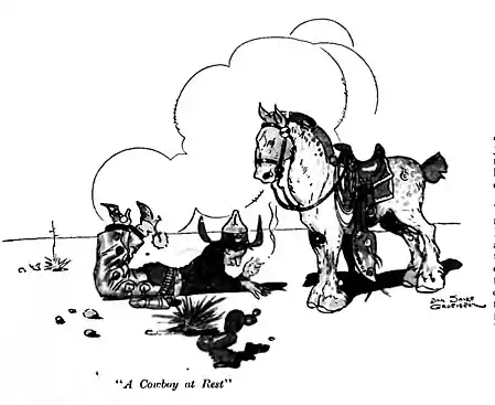 I recall one picture by a celebrated artist of the East who does Western things. It depicts a "Cowboy at rest." He is lying on his stomach in the sun, his chin in his hands. His horse stands near by, with the reins thrown over the horn of the saddle. Now a cowboy in the daytime, well filled with beans and canned tomatoes, would not lie thus; and above all he would not leave his horse standing thus. He would pull the reins down over the horse’s head and let them hang, elsewise his cow-horse would depart. I recall yet another picture of a faithful cow-puncher, who with his trusty rifle defends himself from behind his dead horse, which he uses as a fortress. The dead horse is about four feet and a half through sidewise—excellent for a fortress, but a trifle wide for a thin-flanked cow-horse. It would be useless to point out any detail like this to any earnest artist of today. Worse than useless would it be to suggest that a cow-puncher is the laziest created thing; for in art he must do perpetual "stunts" of "action."