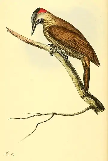 Total length, eight inches and a half; bill one inch long, blackish; front and crown cinereous black; the hind head and nape crimson; a dusky whitish line (beginning at the nostrils) includes the eye and ear-feathers; below this on each side blackish, with longitudinal whitish dots, which in the male is mixed near the bill with crimson; chin blackish, speckled with white. The general plumage above is uniform tawny rufous brown, becoming more olive on the rump. Under parts olivaceous yellow, crossed with numerous close bands of blackish brown. Quills with the inner web black, the margin pale yellow; shafts and outer web tawny; tail the same, the shafts and outer half black, excepting the last pair, which have yellowish shafts and dusky tips. Wings inside, pale orange. Legs and claws dusky green.