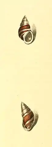 - Shell smooth, conic, of five volutions, the last somewhat distorted; white, with two unequal ferrugineous bands; body whirl rufous, with two white bands. Aperture white.