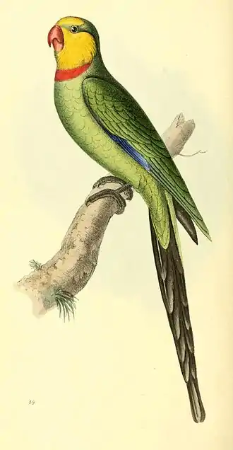 The tail is very long, measuring eight inches three quarters; the total length of the bird being near fifteen inches. The green which predominates over the plumage is bright and changeable, having a blueish tinge on the hind head, which is much darker and stronger on the outer margins of the quills and middle of the tail-feathers: the back and scapulars are tinged with an olive-brown; the spurious quills and their protecting covers are greenish-blue, appearing in some lights entirely of the latter colour; the inner margin of the quills and tail, as well as their entire under surface, deep brownish-black; but the tips of the tail-feathers beneath are much paler; the two middle feathers five inches longer than the outermost, and extending near two inches beyond any of the others; their extremities instead of being pointed are rather widened and rounded. Bill red; ears and space between the eye and bill green; fore-part of the head, chin, and half the neck, a clear orange-yellow, which is terminated by a narrow collar of a beautiful orange-red; the remaining under plumage pale-green; inner wing-covers darker. Legs black. The fourth, fifth and sixth quills notched at their tips.