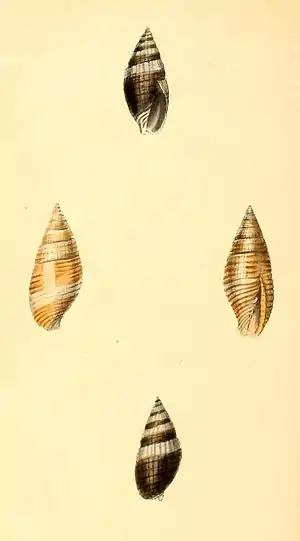 - Shell inversely pear-shaped, brown, with transverse sulcated grooves, punctured within; volutions above obsoletely plaited and banded with white; outer-lip thin, margin crenated; pillar four-plaited; base white, truncated.