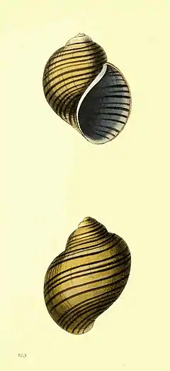 - A. testâ ovato-globosâ, olivaceâ, fasciis obscuro-purpureis angustis ornatâ; spirâ brevi, levatâ, apice acuto; labii margine tenui; umbilico mediocri.