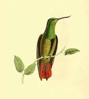 - Golden green; throat shining emerald green; middle of the breast and body black; lateral tail feathers beneath topazine; bill recurved.