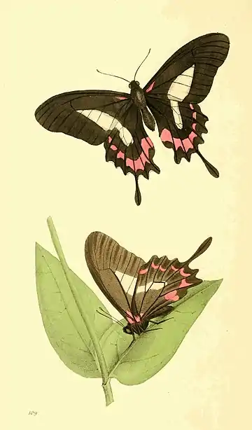 - P. (Troj. caud.) Alis atris, subtùs maculis basalibus coccineis notatis, anticis suprà maculo coccineo basali fasciâque albâ, posticis obtusè caudatis fasciâ marginali maculis coccineis sex insigni, fasciâque mediâ albâ ornatis.